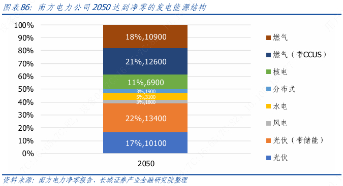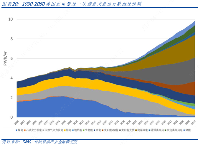 总用电量方面的预测表明,在交通、建筑等用能部门的加速电气化情况下,美国的发用电量将持续提升,最终将在终端用能中占比超过 40%,甚至达到 50%以上。发电量从约目前的5万亿度增加至接近9万亿度。而风电、光伏不仅将支撑起全部新增的发电量,还将补充退役的煤电和气电的发电量。核电和水电的发电量将保持当前规模。