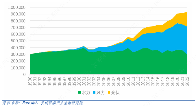 2007 年后,风电光伏的快速发展成为了欧盟碳减排的主要推动力。根据欧洲统计局的数据,欧盟的可再生能源及生物质消费在 2007 年为 5777 拍焦,至2022 年快速增长至10453 拍焦,在总能源消费中的占比也由8.4%增长至17.9%。