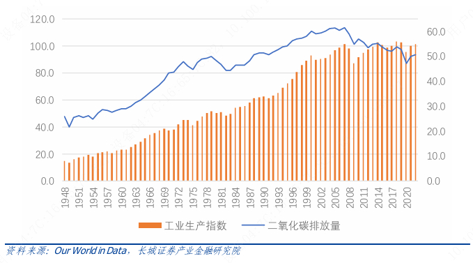 美国温室气体排放于 2007 年达峰,之后持续降低。主要原因是由于其工业生产基本饱和,转向发展第三产业。而同时页岩气革命支撑起其电力系统的快速转型,煤电加快退役。