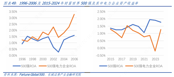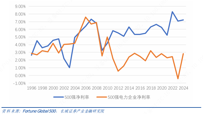 通过分析1996年以来500强及其中电力企业的财务数据,在2008年以前,500强中电力企业的平均净利润率与500强整体均值大体相当,平均资产收益率更是高过整体均值。而在 2010 年以后,500 强中电力企业无论是平均净利润率还是平均资产收益率均显著低于500强整体均值。