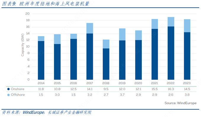 2023 年欧洲风电装机容量为18.3GW,低于2022年(18.9GW)和 2021 年(18.4GW)。速度的放缓主要归因于政策的不确定性、设备成本上升、融资成本上升、漫长的许可流程、选址障碍以及新输电设施建设进展缓慢等。