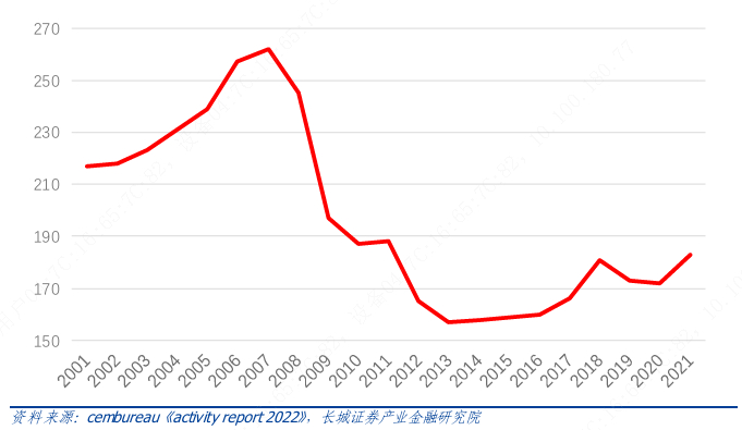 欧盟的水泥产量也经历了相似的过程,在2007年其产量达峰至超过2.7亿吨后快速下降至2013 年的不到1.6亿吨,其后缓慢回升至1.8亿吨左右的水平。