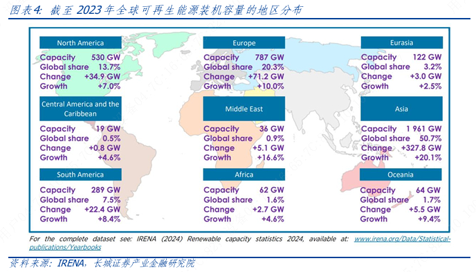 从区域分布来看,亚太地区引领全球增长,欧美地区增速放缓。2023年亚洲地区可再生能源新增装机容量327.8GW(占全球 69.3%),使得该地区可再生能源装机总量达到了1961GW(占全球50.7%)。亚洲地区的强劲增长主要来自中国,其新增装机达到297.6GW。2023 年欧洲和北美可再生能源发电装机容量分别增长 71.2GW(+10.0%)和 34.9GW(+7.0%),非洲地区继续稳定增长(+4.6%),大洋洲地区增加5.5GW(+9.4%)),南美洲继续保持上升趋势增加22.4GW(+8.4%),中东地区创下有记录以来最高增速,新增装机5.1GW(+16.6%)。