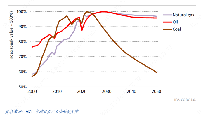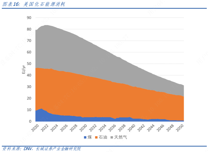 以一次能源消耗看,美国的煤炭、石油、天然气用量都将继续快速减少。主要是由于运输的电气化引领石油需求的大幅下降,而由于太阳能和风能的兴起,煤炭在电力部门被逐步减少。到 2050 年,北美石油需求量的减少几乎占全球石油需求量减少的近一半。从实际情况看,美国的煤炭在2000年已达到峰值,石油需求基本在2021年达到峰值,天然气需求则预计在2025年左右达到峰值。