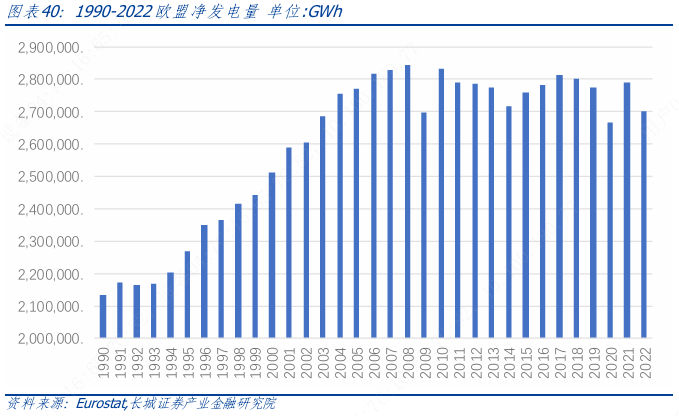 欧洲统计局给出的1990-2022年欧盟27国历史年净发电量如下图所示。从图中可以看到,早在2007年欧盟净发电量就进入了2700-2800TWh的平台期。