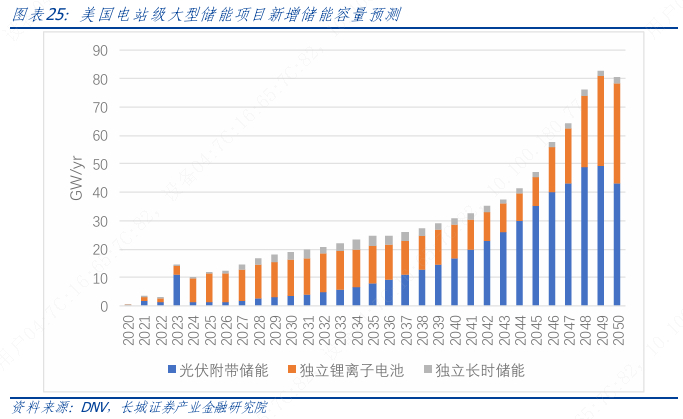 能源、特别是电力的储存对于可再生能源渗透率较高的电网稳定运行与电力市场至关重要。虽然主导技术可能会随着时间的推移而改变,但主要的储能规模增长将由锂离子所主导。到 2030 年,预计电力系统储能容量将从当前的 12GW/25GWh 增长十倍至约120GW/360GWh。与此同时,长时储能(8小时以上)会随着技术进步、成本降低不断扩大装机规模。到2050年,美国电网系统的储能预计将超过500GW/2TWh。这种增长得到了成本削减、电动汽车部署和根据《2022年通胀降低法案》提供的新投资税收抵免的支持。