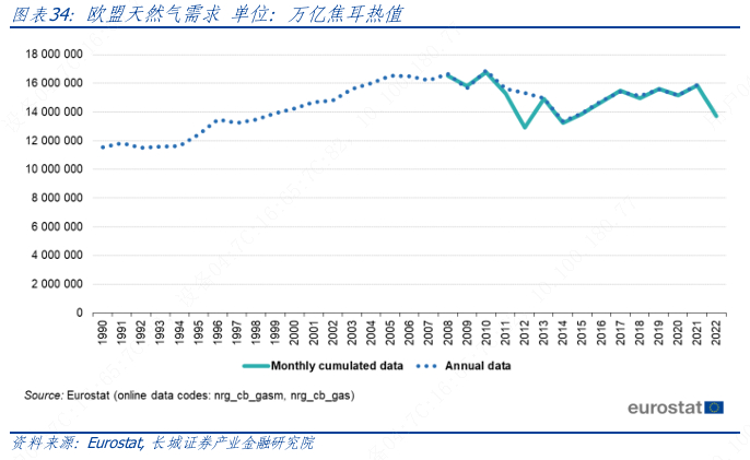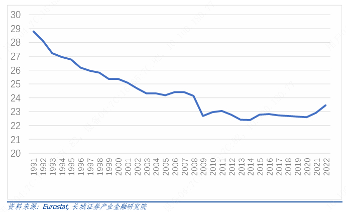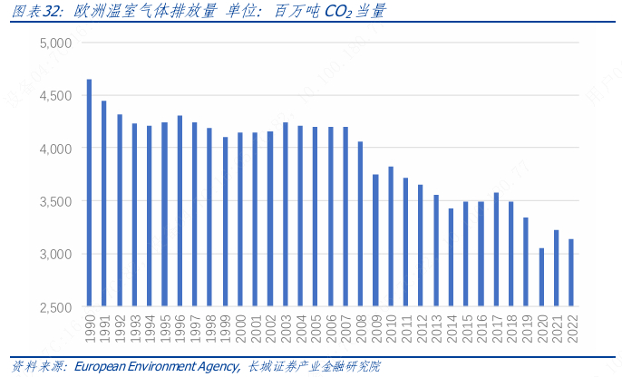 而从需求侧看,欧洲碳达峰背后经历了深刻的的产业结构调整,欧盟第二产业在总GDP中占比从1990 年的28.8%最低降至 2014 年的约 22.4%,然后小幅回升至 2022 年的23.47%。