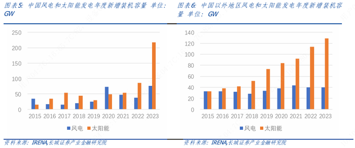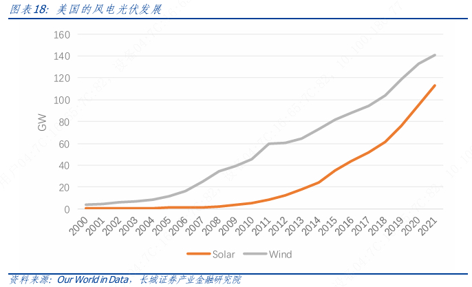 从新能源发展看,美国的风电和光伏分别从2000年和2010年起进入快速发展期,截至2023 年底风电装机已超过140GW,光伏装机接近120GW。