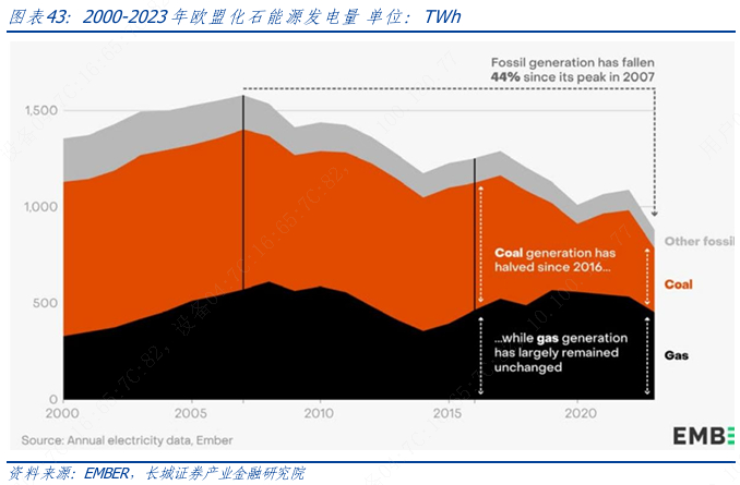 早在2007 年,欧盟化石能源发电量就已达峰,而自2007年以来,欧盟化石能源发电量已下降了44%。2023 年,欧盟煤炭发电量下较上一年降了26%,达到历史新低,天然气发电量也连续四年下降。电力部门的碳排放量下降了19%,是历史上最大年度降幅。