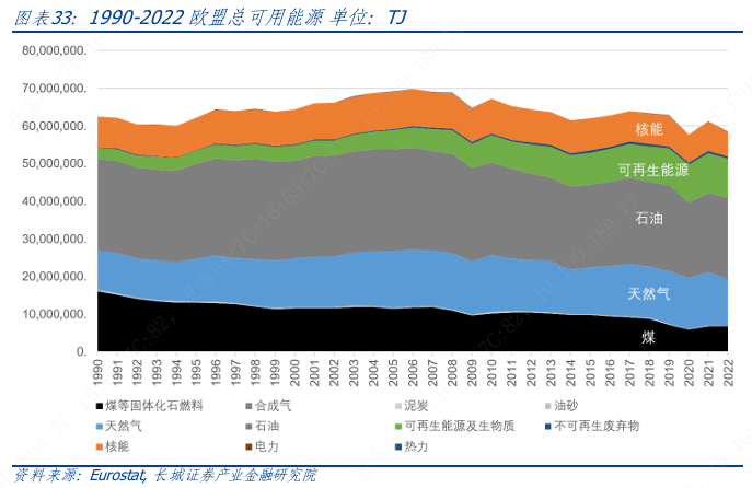 根据欧盟统计局公布的数据,2022年欧盟27国能源消费结构中石油占比约为37%,占据首要地位,天然气消费占比约为21%,石油和天然气消费占比接近六成,其余可再生能源占比接近18%,核能占比11.7%,煤炭占比11%。