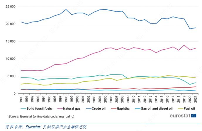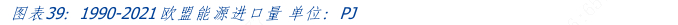 回顾欧盟能源转型过程,从供给侧看,1990-2007 年,欧盟的碳减排的主要贡献来源于天然气对煤炭等高排放燃料的替代。从下图中给出的1990-2021年欧盟天然气消费需求中可以看到,欧盟天然气需求在1990-2005年由不到12000拍焦(PJ,10的15 次方焦耳,等于1000TJ)快速增长至超过16000拍焦。2005 年后天然气消费量则在13000至16000 拍焦间徘徊。