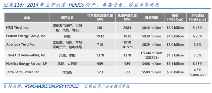 (3) 融资平台:放入 YieldCo 的发电资产应该是已经并网的,没有开发风险的,满负荷运营了一段时间的,不存在限电现象,回报比较稳定的资产。