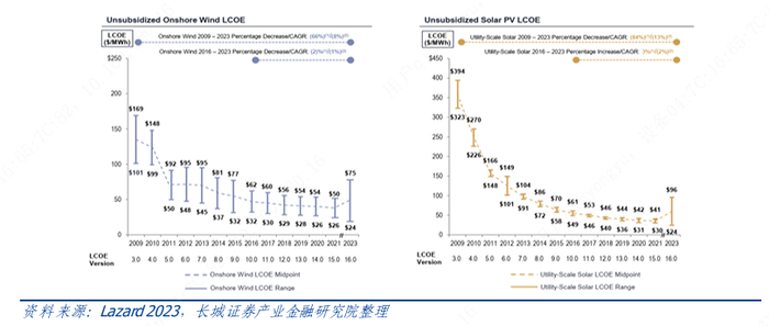 技术进步带来的度电成本持续下降是驱动美国光伏和风电装机量大幅提升的重要因素之一。根据Lazard 的测算,2009年至 2023 年期间,美国风电补贴前平均度电成本从135美元/MWh下降到49.5 美元/MWh,累计降幅为66%,美国光伏补贴前平均度电成本则从358.5 美元/MWh 下降至60美元/MWh,累计下降84%。