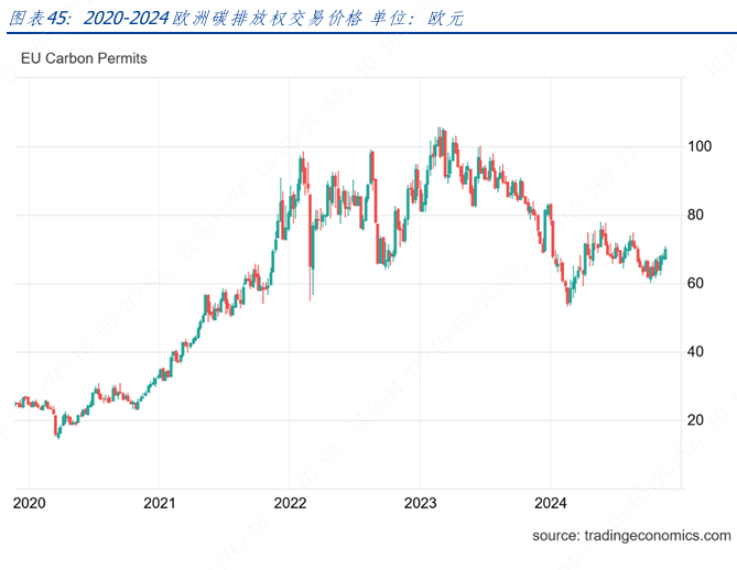 出于对经济放缓的担忧,欧洲两大碳价自2023年下半年起就持续承压。欧盟碳价在2024年2月23 日创新低,跌至54.21欧元/吨,进入3月虽有所回升,但仍然仅维持略高于60 欧元/吨的水平。2024 年以来,在气候温和、工业用户需求放缓、制造业活跃度持续萎缩等因素共同作用下,碳密集型行业不急于购买更多碳排放配额,从而导致市场供过于求。