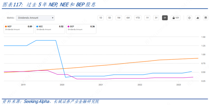 随后几年,YieldCo 模式在电力能源行业的应用快速发展,在2015年时已达到15家上市,2016 年达到24 家。作为收益增长型上市公司,NextEra的YieldCo(NEP)自首次公开募股以来,几乎每季度都提高股息(如下图所示),而Brookfield Renewable Partners(BEP)是该行业延续时间最长的YieldCo 之一,同样也有着出色的增长记录。