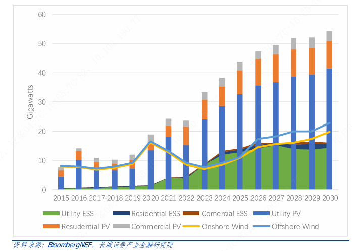当前情况是,由于电网线路限制和接入审批流程问题,截至 2023 年底美国新能源发电并网排队容量已超过1450GW,储能并网排队容量超过500GW,累计超过2300GW,并网周期由2015年的3年左右增至当前的5年左右,甚至有2010年申请的项目仍在排队中。尽管美国政府已意识到电网投资建设相关问题的严重性,FERC正通过制定新的规章和促进National Environmental Policy Act(NEPA)和利用 IIJA 等法案,缓解排队并加速电网投资不足和新能源并网困难等问题。但总体进展仍不乐观。据BENF预测,到2030年美国电网将增加至少380GW并网容量。然而,考虑到2030年前新能源装机的快速发展,目前输电线路建设的节奏仍将限制未来十年可再生能源发展速度。