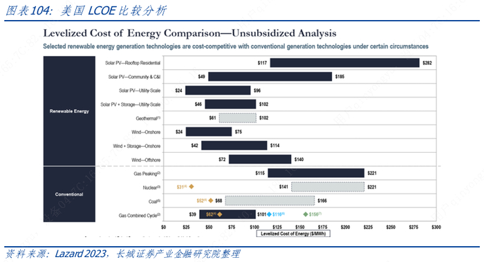 从平均度电成本(Levelized cost of energy, LCOE)来看,目前以太阳能和风能为代表的可再生能源已经成为美国最具备经济性的电源类型。根据Lazard 的评估,2023 年剔除补贴前电网级光伏(60美元/MWh)和陆上风电(50 美元/MWh)的平均度电成本已经低于燃气发电(70美元/MWh)、核电(126美元/MWh)和燃煤发电(109美元/MWh)等传统能源类型,现阶段具备更好的经济性。