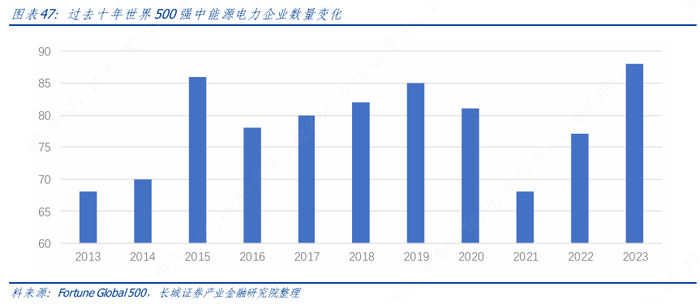 能源电力是国民经济的先行产业,是反映一国经济和发展道路的重要行业样本。过去十年中,世界 500 强中能源电力企业数量为 68~88 家,占世界 500 强的比重大约为14~18%。这其中的企业,排名较为靠前的主要是与原油生产、采矿、炼油、油气设备和公共事业(涵盖天然气与电力)相关的企业。