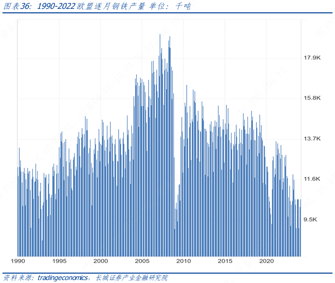 具体来看,高能耗产业的典型代表钢铁、水泥产量均在 2007 年达峰。根据欧洲钢铁协会(EUROFER)的数据,欧盟的粗钢产量在2007 年达峰至 2.094 亿吨,而 2022 年则仅有1.363 亿吨,其中德国占比27%大幅领先其他成员国。