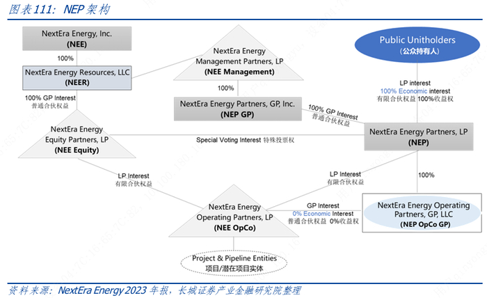 NEP 于2014 年推出,是一个以收益增长为导向的有限合伙企业,通过有限合伙人在NEP OpCo 的权益收购、管理和拥有具有长期稳定现金流的清洁能源合同项目。NEP 的项目包括NEER 出资或从其收购的能源项目,或从第三方收购的项目,以及从第三方向其收购的合同天然气管道的所有权权益。NEP还不时投资为其某些资产提供动力或扩大其资产。截至2023 年,NEE拥有 NEP的非控股普通合伙人权益,并实际拥有NEP约52.6%的投票权;NEP拥有NEP OpCo 的控股普通合伙人权益和48.6%的有限合伙人权益。此外,NEER 在NEP OpCo 的间接有限合伙权益约为51.4%,NEER将其在NEP的所有权按照权益法投资核算,并将其对NEP的项目销售作为第三方销售核算在其合并财务报表中。具体结构如下: