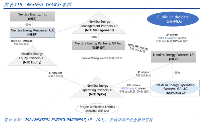 第二种架构源于NextEra 的 YieldCo(NEP),如下图所示,与第一种架构相比,通过合伙结构,进一步提升了控制权,同时释放出更多份额的收益权给公众持有人。在其架构中,母公司NextEra Energy 将其拟置入资产纳入NEP下的NextEra Energy Operating Partners(NEP OpCo)旗下,NEP 在纽交所公开上市融资,由母公司间接控制的NextEra Energy Partners GP 担任普通合伙人(不享有经济利益),NEP 拥有NEP OpCo 的控股非经济普通合伙人权益和48.6%的有限合伙人权益,NextEra Energy Equity Partners(NEE Equity)作为有限合伙人拥有NEP OpCo 约51.4%的普通股,代表有限合伙权益和NEP OpCo 的100%B类合伙权益,NEE Equity 可以对其NEP OpCo 普通股进行投标,并在一对一的基础上获得NEP普通股,或根据交换协议的条款以现金形式获得此类普通股的价值。公众股东作为有限合伙人(享有YieldCo100%收益)。在这一架构下,YieldCo 通过用募集资金向NEE Equity 收购及直接增资的方式,获得NEP OpCo的收益和投票权,NEE Equity 在交易完成后保留NEP OpCo 的多数收益和投票权,实际持有资产的NEP OpCo可将增资款用于补充流动资金收购等日常经营;母公司通过作为YieldCo 的普通合伙人拥有YieldCo 的多数投票权并实现了对YieldCo 的控制,同时通过在NEE Equity 中的合伙份额获得收益。