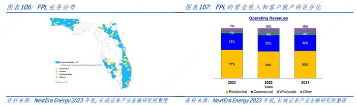 FPL 是 NEE 发展的基石。FPL是一家受费率管制的电力公司,主要从事和投资佛罗里达州的发电、输电、配电和销售。1925年,在美国发电系统整合的全盛时期,佛罗里达电力与照明公司(FPL)合并(成立)。1950年,FPL成为一家在纽约证券交易所上市的独立上市公司,经过近一个世纪以来的成长,截至2023年12月31日,FPL的总装机为33GW,输电和配电线路约90,000 英里(circuit miles),变电站 883 座,通过将其发电设施与客户连接起来的综合输配电系统通过大约590万个客户账户为1,200多万人提供服务。FPL 还拥有一家天然气零售公司,该公司通过3,795 英里的天然气配送管道为佛罗里达州南部八个地区的约119,000名居民和商业天然气客户提供服务。FPL的营业收入结构如下图所示。