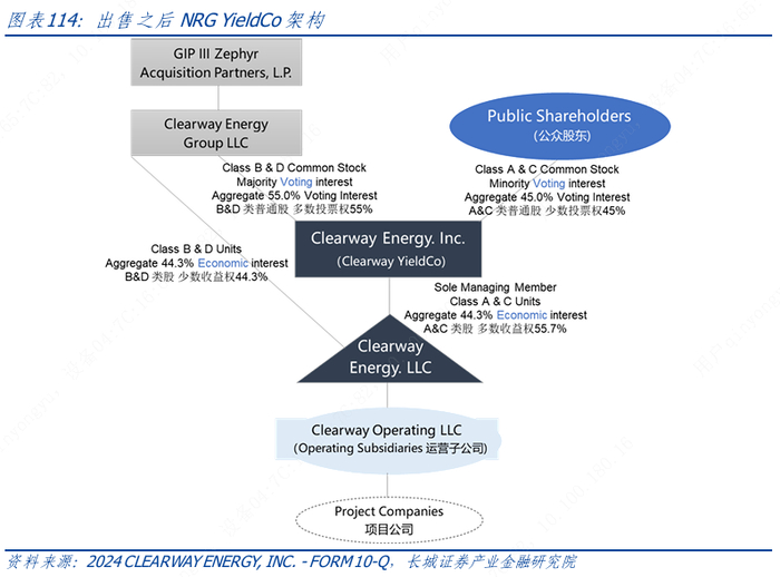 在首次公开募股时,NRG Energy 通过B类股票拥有65%的投票权,到2015年,由于继续发行A类股票为下拉式收购提供资金,这一比例已降至55%。同时,为了保持控制权,NRG Energy 开始进行资本重组,创建了C类和D类股票,并以1比1的比例发行了当时现有的A类和B类股票。然而,与A股和B股相比,新发行的股票只有1/100的投票权。从那时起,公司进一步发行的股权仅为C类股票,这在一定程度上稀释了控制人的投票权。随着NRG Energy 业务持续增长,债务持续增加,NRG Energy 决定剥离其在NRG Yield 的股份,并出售其大部分发电资产,以专注于其零售业务。最终,根据2018年2月公布的交易,基金管理公司Global Infrastructure Partners(GIP)收购了 NRG Yield的控股权以及NRG Energy 的可再生能源开发和运营平台,NRG Yield更名为Clearway Energy,作为发起人的 GIP 拥有 55%的投票权和 44.3%的经济利益,而公众股东控制着45%的投票权,55.7%的经济利益。普通股有四类(A类、B类、C类和D类),其中只有两类(A类和C类)公开交易。A类(CWEN.A)的投票权是C类(CWEN)的100倍。同样,B类的投票权是D类的100倍(但这些都是由GIP持有的),具体重组后的架构在原有架构上进行深化,较原有架构提高了控制权,降低了收益权,具体如下: