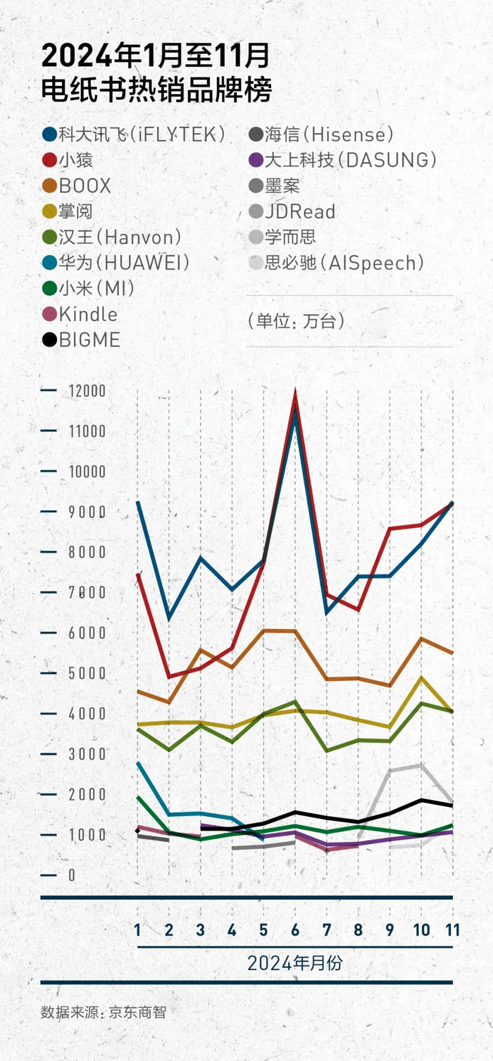 根据京东商智电纸书热销品牌榜(按成交金额排名),2024年前11个月,科大讯飞有7个月位列榜首,小猿在另外4个月摘得销售额桂冠。