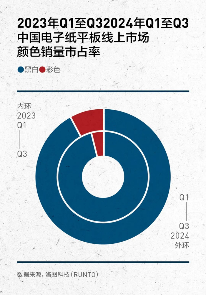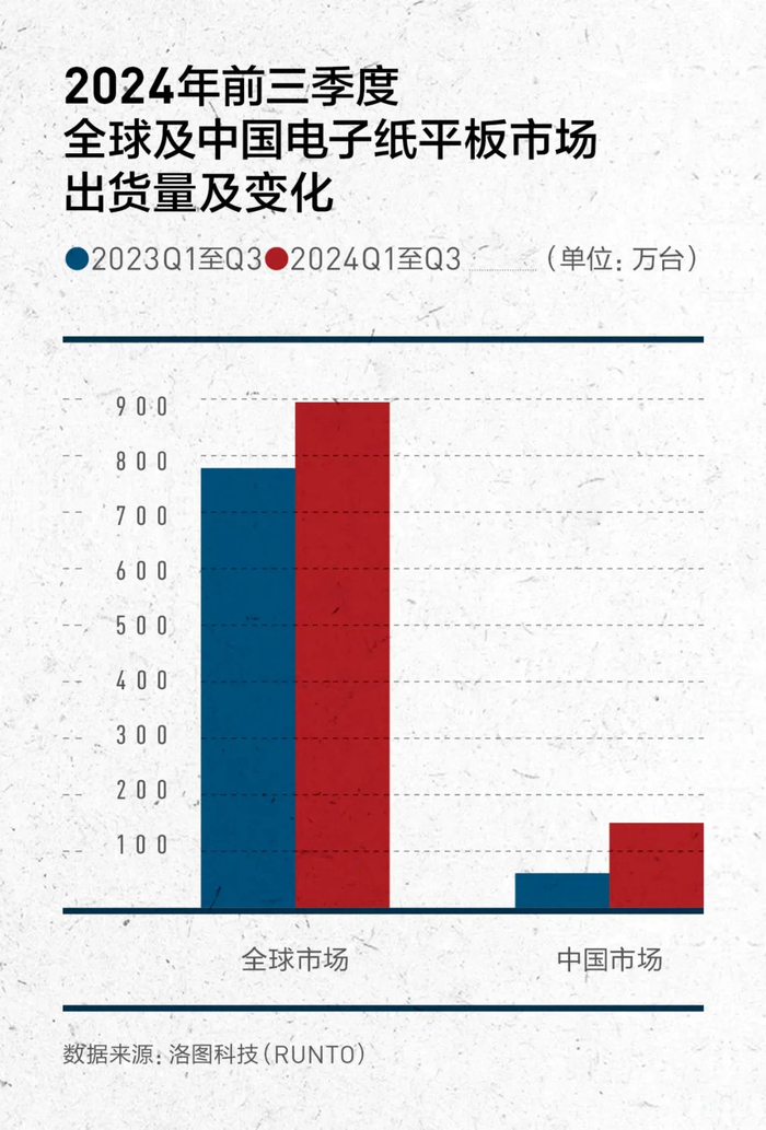 而2024年,中国电子纸平板市场显现出更为强劲的增长趋势。洛图科技(RUNTO)数据显示,2024年前三季度,中国电子纸平板出货量为148.2万台,同比增长128.4%,远高于全球同期的22.1%增速。