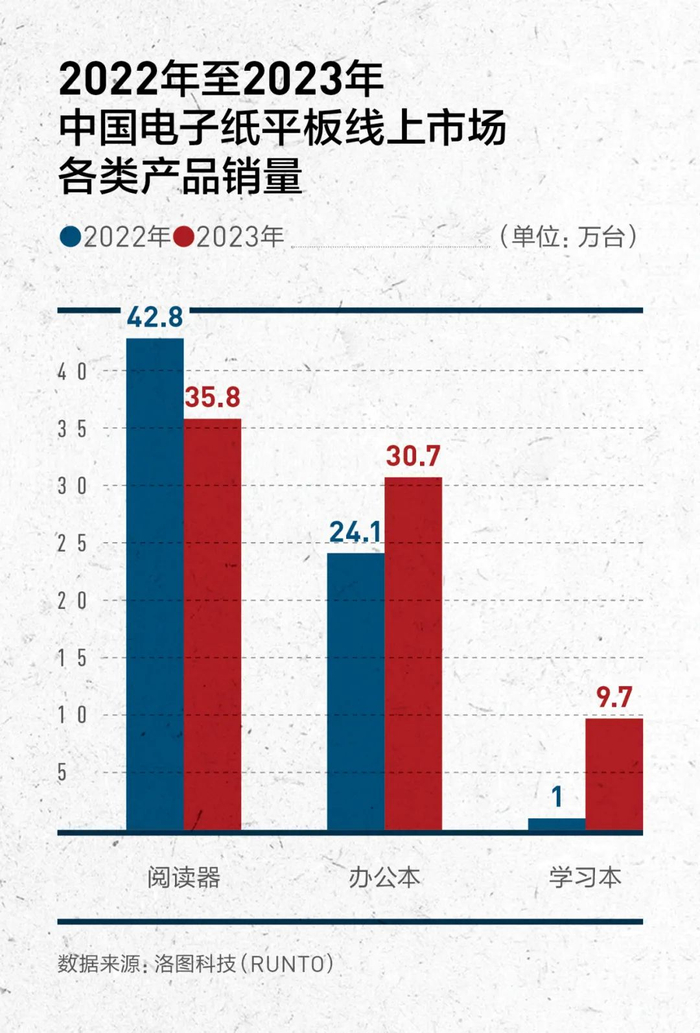 根据洛图科技(RUNTO)线上全渠道数据,2023年,阅读器线上销量仅为35.8万台,同比下降16.4%,整体占比也由2022年的63%下降至2023年的47%;办公本线上销量为30.7万台,同比增长27.4%,市场份额达到40.3%,同比增长4.8个百分点;学习本线上销量为9.7万台,同比增长870%,市场份额同比增长11.2个百分点至12.7%。