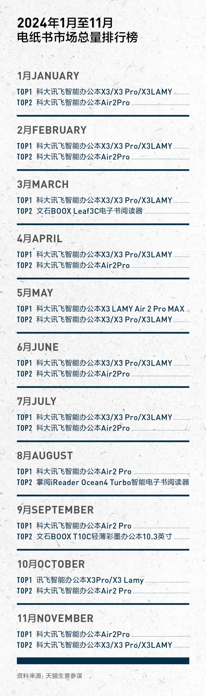 根据天猫生意参谋2024年1月至11月电纸书市场总量排行榜,科大讯飞办公本产品霸占了销售额第一;而在1月至11月销售额榜单中,科大讯飞智能办公本产品占据了8个席位,文石阅读器、文石办公本、掌阅阅读器占据剩下3个席位;“探花”榜中,科大讯飞智能办公本也占据过半席位,文石、掌阅则在销售额第四名、第五名拥有强烈“存在感”。