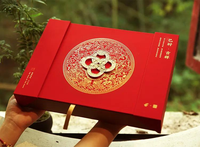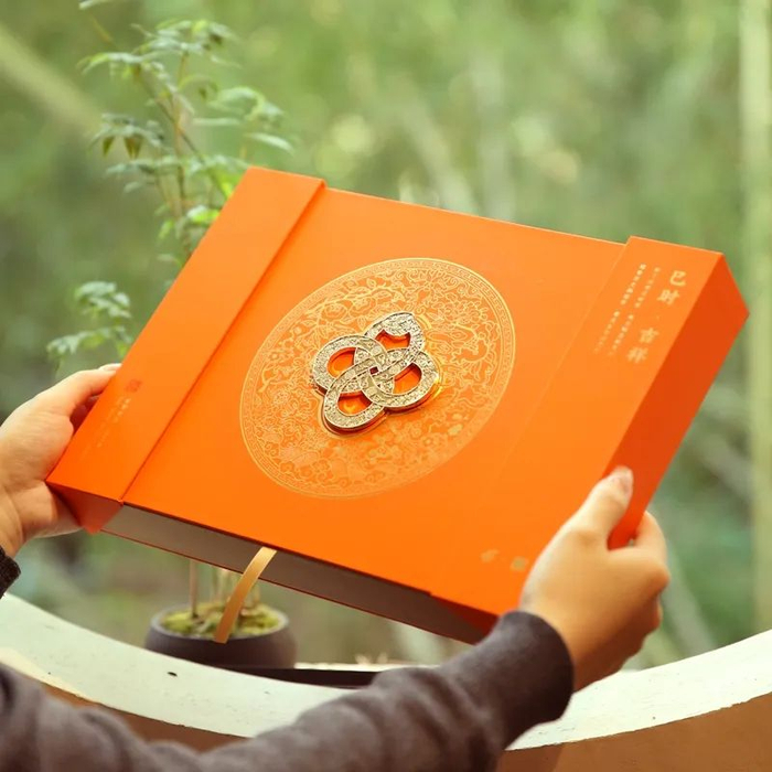 礼盒外附赠一只精美的手提袋,金色烫印的“巳时吉祥”与图案呼应,整体设计雅致大气,适合送礼或收藏。