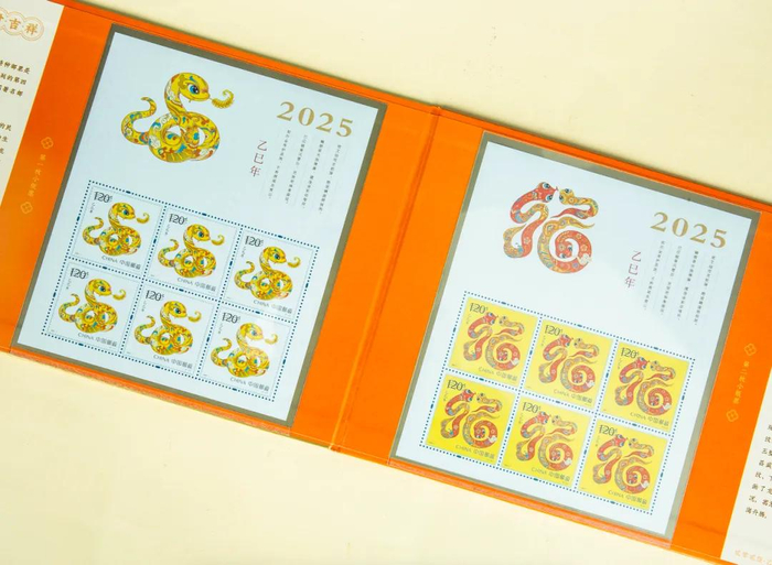为了迎接乙巳青蛇年,西泠印社联袂中国邮政,打造了2025年《巳时吉祥》生肖邮票印章纪念册年礼。