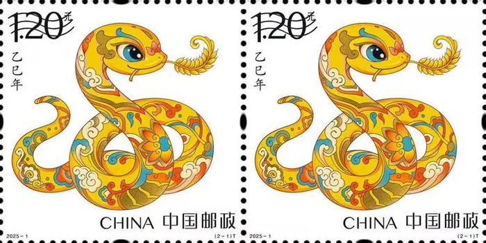 2025年生肖邮票一套两枚——《蛇呈丰稔》和《福纳百祥》,面值均为1.20元。这也是中国第四轮生肖邮票序列中的第6枚,由著名邮票设计师张旺与潘虎设计。