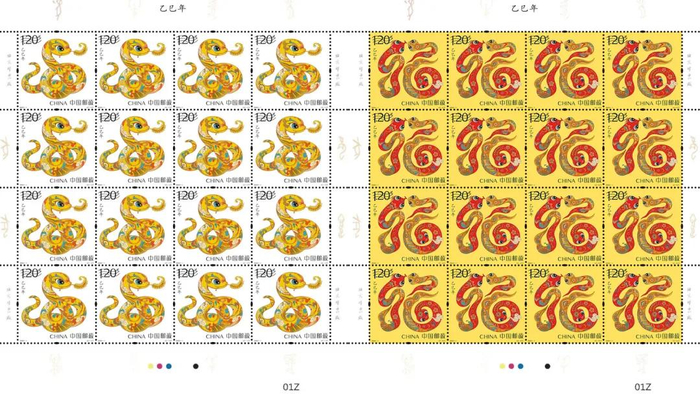 ▲蛇年邮票《蛇呈丰稔》和《福纳百祥》。