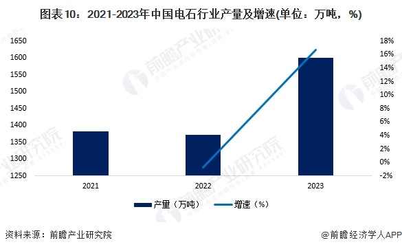 2021-2023年,中国电石行业产量先降后升,2023年电石产能增长带动产量提升,2023年底,中国电石产量超过1600万吨,同比增速达到16.7%。中国电石产业链中,大部分为一体化模式发展,下游多配套PVC生产装置,所以电石的产量更多体现的是下游PVC产量的增长。