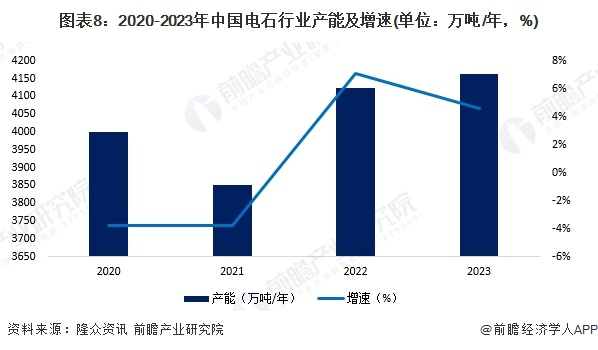 近年来,随着我国环保意识的不断增强,对电石行业新增产能的控制愈发严格,2020-2023年我国电石行业产能先降后升,2023年中国电石行业产能达到4164万吨,同比增长1%,增速明显下降。