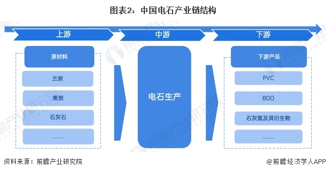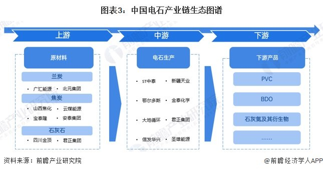 中国电石行业上游是原料,主要包括兰炭、焦炭和石灰石。中游是电石制造,电石的下游对应的是PVC、BDO以及石灰氮及其衍生物等产品。
