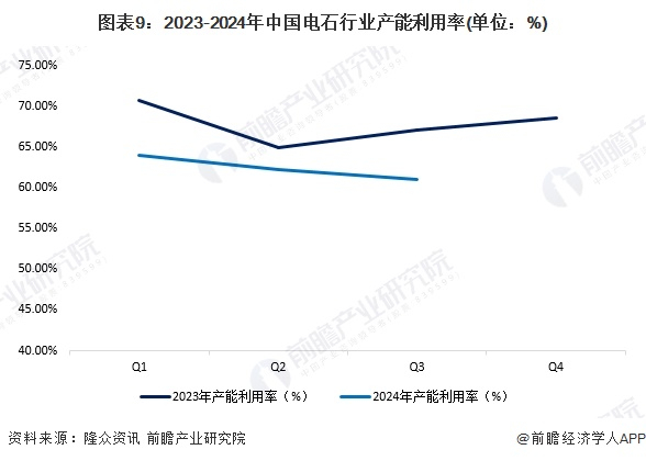2023年,中国电石产能利用率先降后升,2023年第四季度产能利用率约68.5%,仍处在较低水平,而2024年,行业产能利用率总体下滑,前三季度开工率均在65%以下。