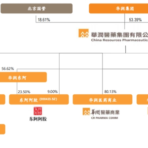 当年,华润系便正式和聊城市国资局签订合资协议,组建华润东阿阿胶有限公司,持有东阿阿胶29.62%股权。华润持有“华润东阿阿胶”56.619%股份,聊城市国资委持股43.381%。换算比例下来,华润间接持股东阿阿胶16.77%。
