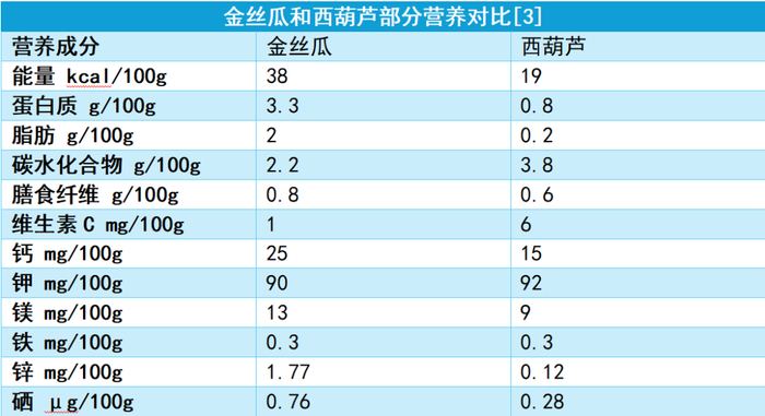 吃上 100 克金丝瓜就能分别满足成年男性和女性每天锌需求量的 15%和 21%了,还是挺不错的。至于金丝瓜和西葫芦的热量,都不算高,属于低热量、低脂肪、低碳水化合物的食物了,所以减肥控糖都能放心吃。