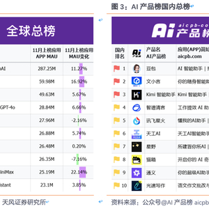 近期,AI领域再掀热潮,字节跳动旗下大模型产品“豆包”成为市场焦点。根据AI产品榜11月榜,豆包MAU已达到近6000万,目前仅次于ChatGPT排名全球第二,在国内榜单显著领先位于榜首。AI是未来的星辰大海,各大厂在大模型领域各显神通,投入了极高的资源及重视程度,为什么是字节后来居上呢?字节AI产业链中又有哪些投资机会值得重视?