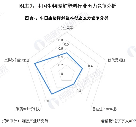 根据以上分析,对各方面的竞争情况进行量化,1代表最大,0代表最小,目前我国生物降解塑料行业五力竞争总结如下: