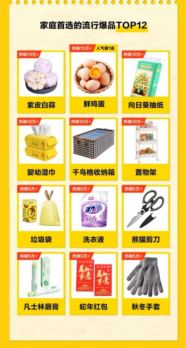 此次家庭首选的流行爆品TOP12中,紫皮白蒜、鲜鸡蛋是“家庭餐食必备”,凡士林唇膏、蛇年红包、秋冬手套是“年底应季限定款”,向日葵抽纸、婴幼湿巾、洗衣液、千鸟格收纳箱、置物架、垃圾袋、熊猫剪刀则可以让居家环境更整洁。
