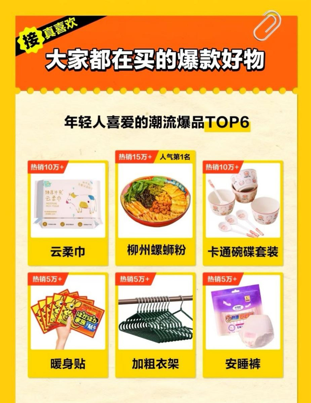 大家都在买的爆款好物中,云柔巾、柳州螺蛳粉、卡通碗碟套装、暖身贴、加粗衣架、安睡裤成为年轻人喜爱的潮流爆品TOP6,主打“便宜囤囤囤”。