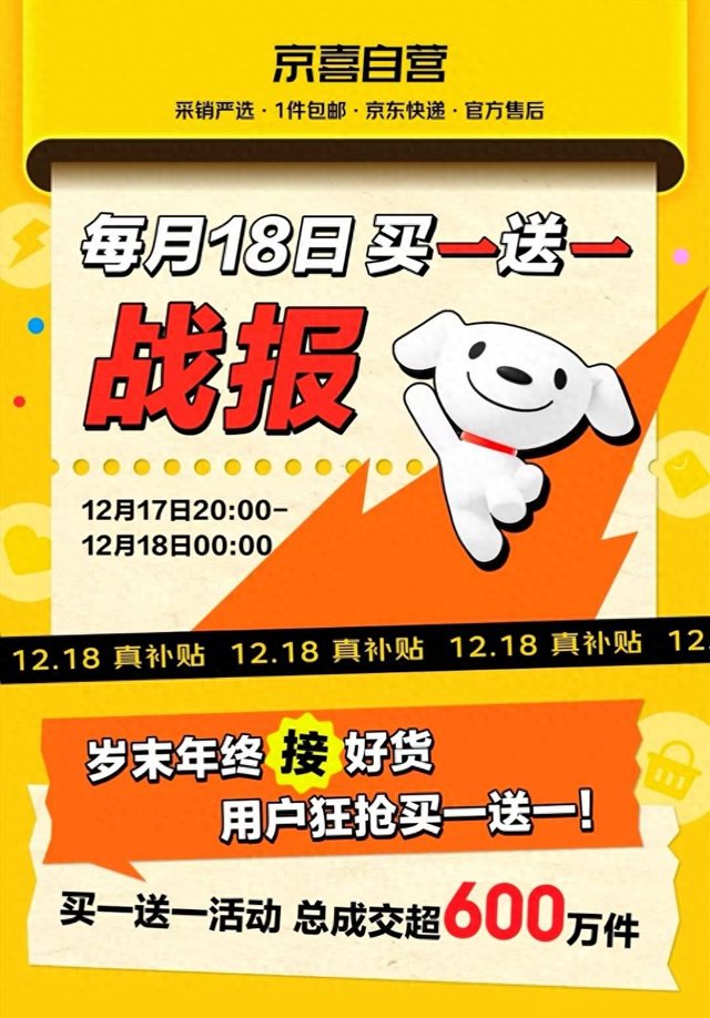 12月19日,京东旗下特价购物品牌京喜发布京喜自营“12.18买一送一”全周期战报。12月17日20点至12月18日24点的销售数据显示,在京喜自营岁末买一送一等多重优惠下,实现总成交超600万件的佳绩。