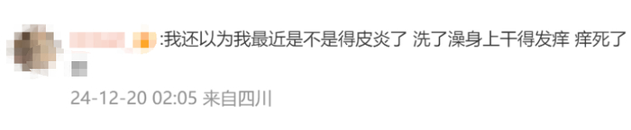 文中提到,最近一段时间,干冷空气连续南下,空气非常干燥。过于频繁的洗澡会加速破坏皮肤油脂层,轻则让皮肤干燥紧绷不适,重则会导致皮肤皱裂发痒甚至更多症状。