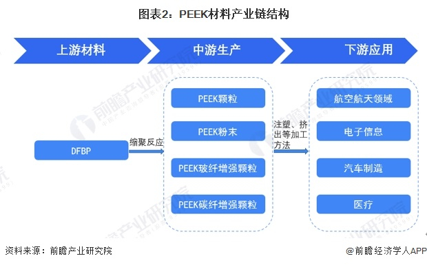 在产业链方面,PEEK材料产业上游原材料主要为DFBP,它是生产PEEK的关键原料。按照化学反应原理及行业生产经验计算,每生产1吨PEEK需要消耗约0.8吨DFBP单体。中游环节则涵盖了PEEK颗粒、PEEK粉末、PEEK增强颗粒等多种形式的PEEK材料制造。由于PEEK具有强度大和重量轻的特点,其下游应用主要集中在航空航天、电子信息、汽车制造、医疗等对轻量化要求较高的领域。