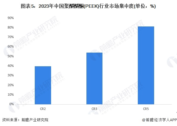 市场集中度是衡量一个行业竞争格局的重要指标。根据我国聚醚醚酮行业的市场份额计算,2023年我国聚醚醚酮行业的市场集中度呈现出较高的水平。其中,CR2(前两大企业市场份额之和)接近40%,CR3(前三大企业市场份额之和)超过50%,而CR5(前五大企业市场份额之和)更是超过了80%。可以看出,,我国聚醚醚酮行业的头部企业优势明显,市场竞争格局相对稳定。