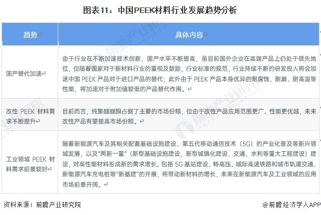 前瞻产业研究院认为,近年来中国聚醚醚酮(PEEK)行业市场竞争集中体现在国产产品与国外公司产品之间的竞争、PEEK对于附加值较低的工程塑料替代、PEEK对于钢材等功能相近产品的替代方面,未来随着国产替代的不断加速,PEEK材料在新能源汽车及工业领域的市场前景较为开阔。